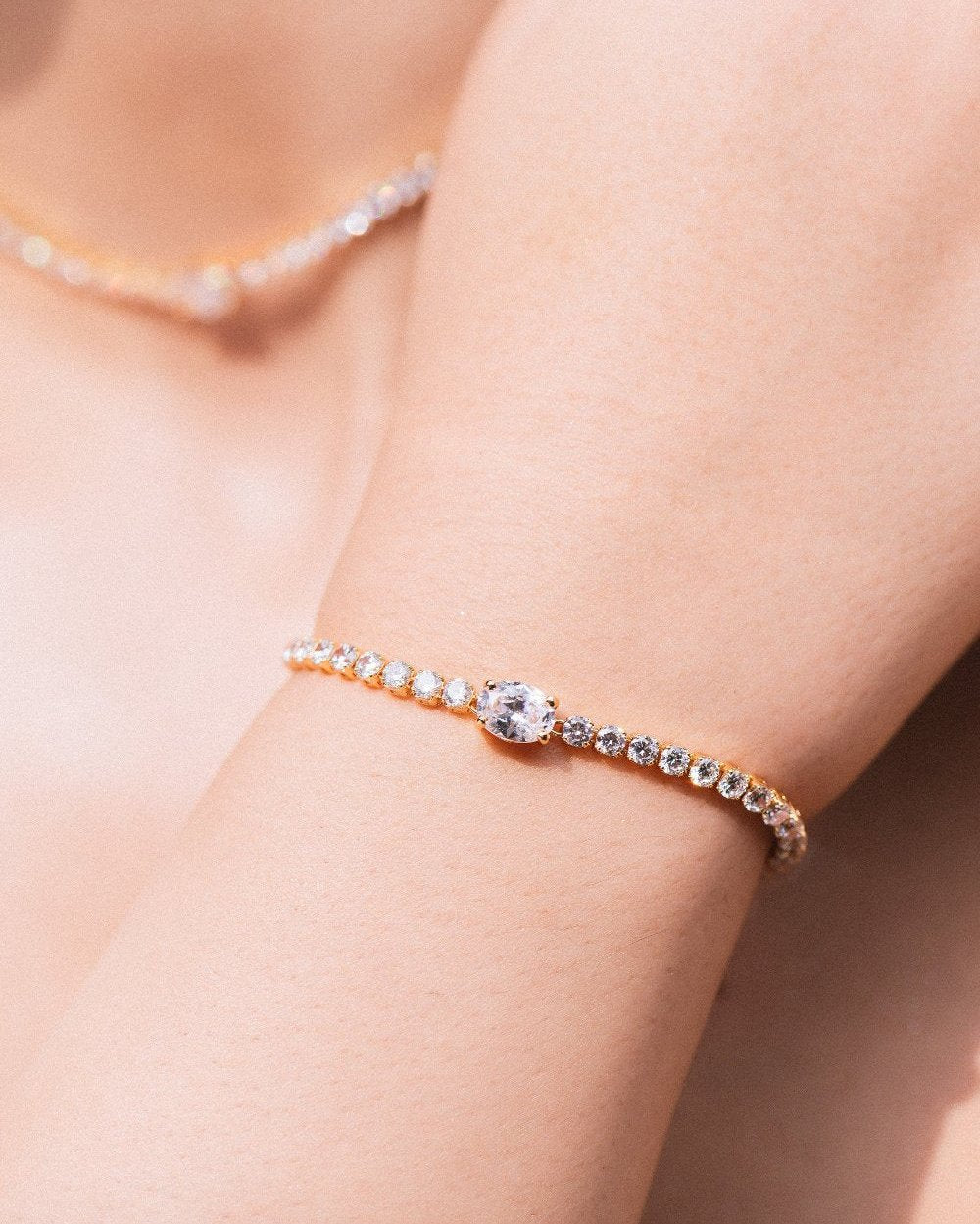 An exquisite combination of an oval-cut stone and a classic tennis chain style. Whether you’re headed to a fancy dinner or a casual link up, let your light shine with the Adeline Bracelet.