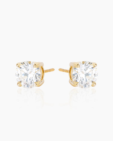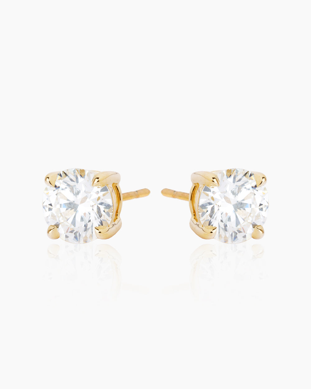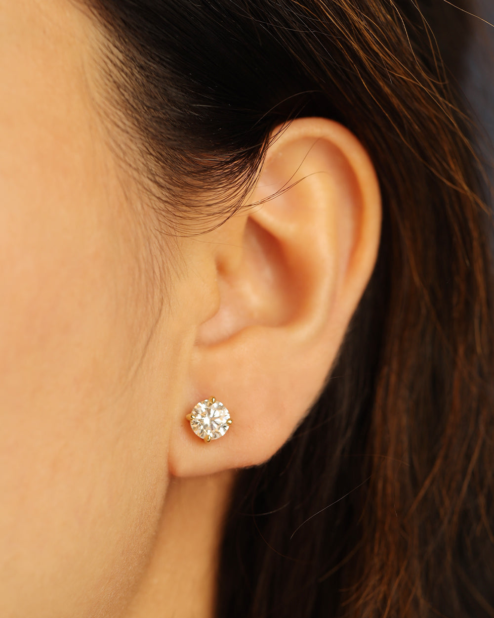 Solid yellow gold stud earrings featuring two brilliant round-cut lab-grown diamonds secured in a four-prong setting.