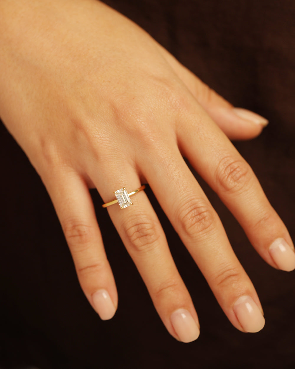 Sleek white gold solitaire ring featuring a vertical emerald-cut lab-grown diamond and a hidden halo.