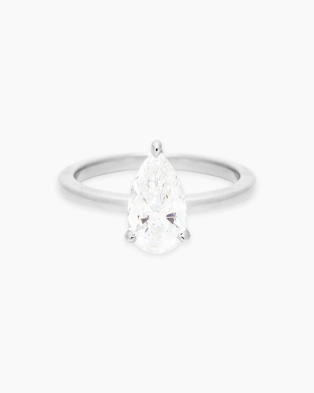 White gold solitaire ring featuring a pear-cut lab-grown diamond set in prongs with a refined hidden halo.