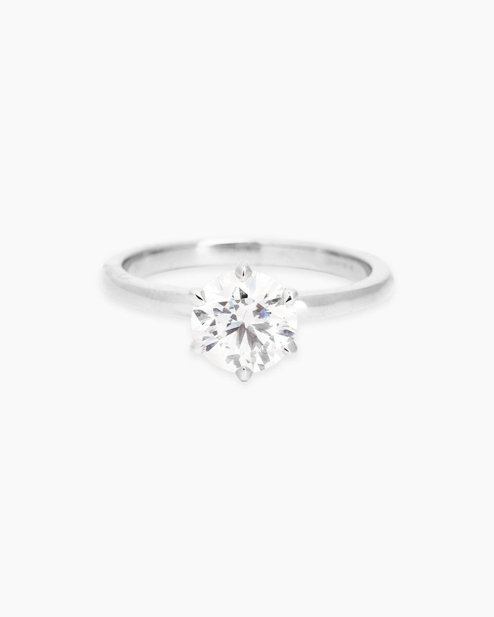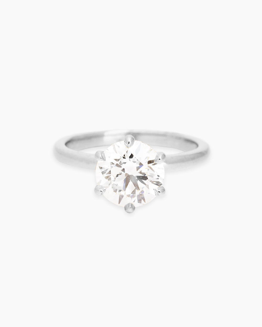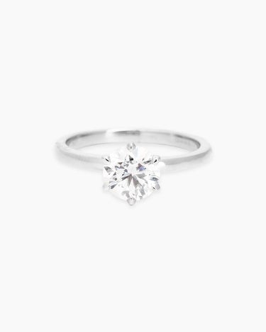 White gold solitaire ring featuring a brilliant round-cut lab-grown diamond secured in an elevated six-prong setting with a hidden halo.