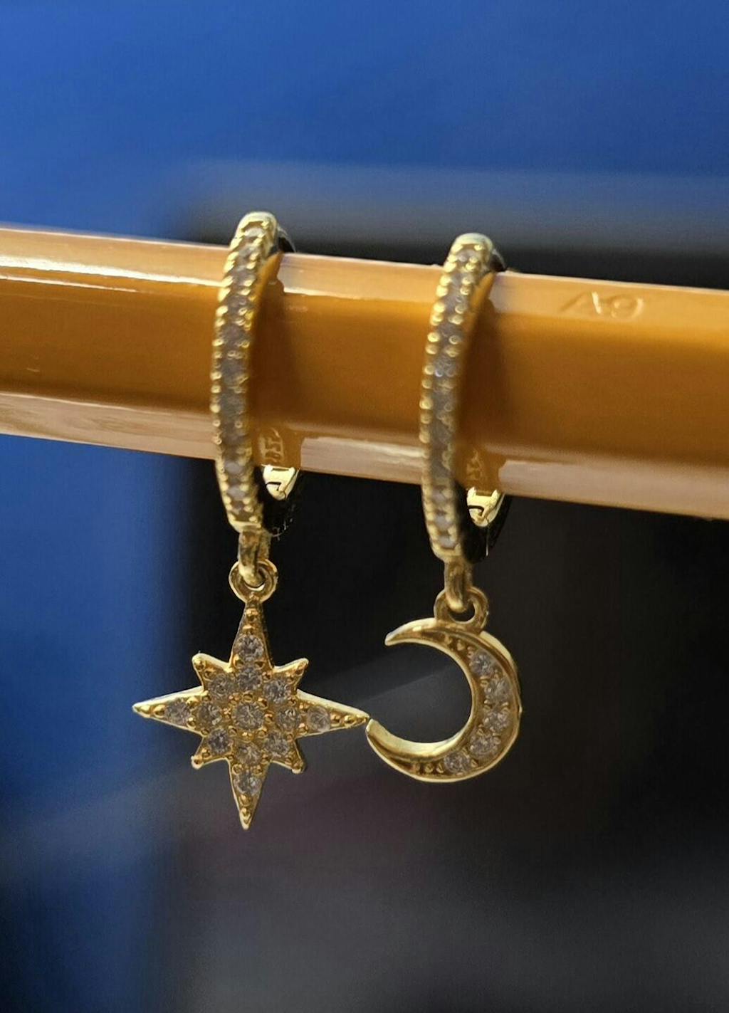 Wish upon your ears. These sparkling Sky Gold Huggies feature a star and moon charm suspended from pavé-set hoops for a playful celestial look. Now upgraded with a more secure clasp and enhanced 14k gold plating for lasting shine.