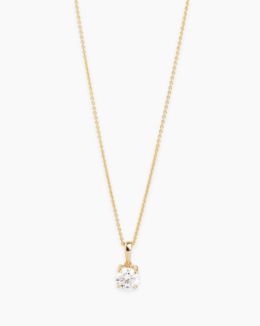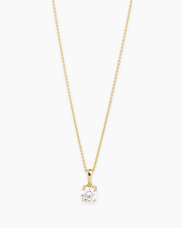 Solid yellow gold pendant necklace featuring a brilliant round-cut lab-grown diamond secured in a classic four-prong basket.