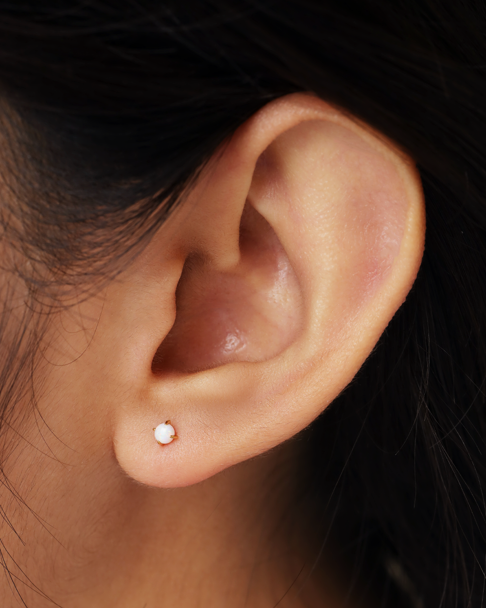 The Mel Flatback Studs feature a beautiful lab grown opal in a prong setting, secured with a comfortable flatback post. These unique studs catch the light with iridescent flashes, adding a touch of color and magic to your ear stack. Available in both gold and silver finishes.