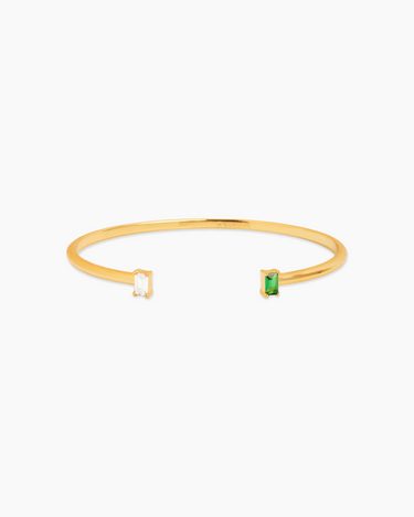 A bold, open bangle that captures the luxurious energy of the Emerald City. It features a rich, emerald-cut green cubic zirconia balanced by a sleek baguette-cut clear cubic zirconia – a modern piece of unapologetic glamour.