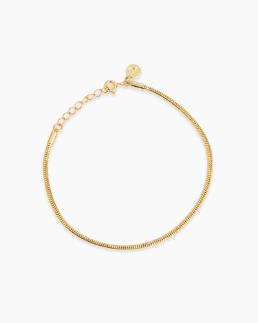 Meet the Steph Gold Bracelet, designed for maximum shine. This rounded snake chain (also known as a herringbone) sits flat against the skin, reflecting light like liquid gold. It’s the perfect piece for adding a touch of high-fashion elegance to a minimalist look.