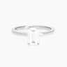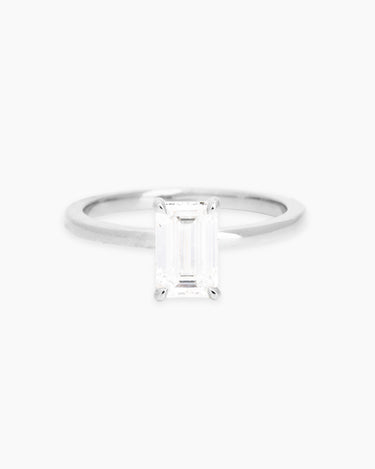 Sleek white gold solitaire ring featuring a vertical emerald-cut lab-grown diamond and a hidden halo.
