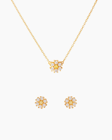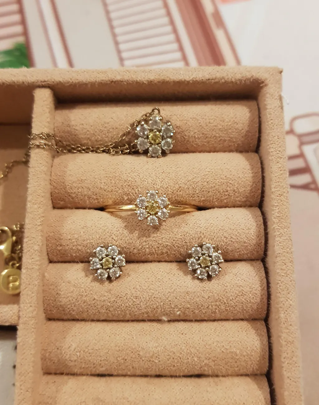 Your jewelry collection gets a fresh update with the Flora - featuring a row of gorgeous clear cubic zirconia stones surrounding a single yellow stone, these subtle statement pieces will have you blooming any time of the year. .