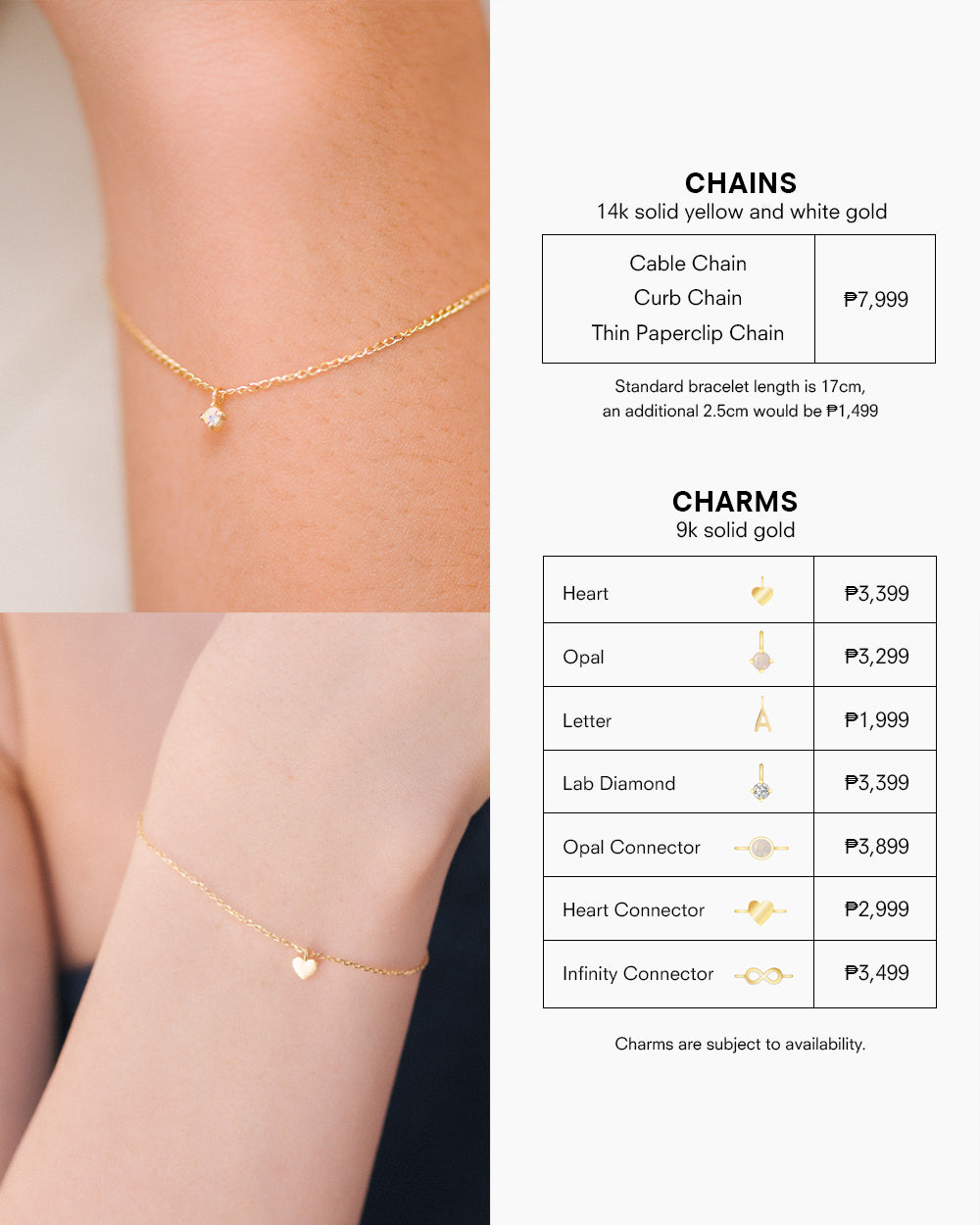 NOTE: This amount is only for the confirmation fee, which is deductible from your final payment. The price of the actual bracelets start at P7,999, depending on the chain style and charms added. View the photo carousel for more information.