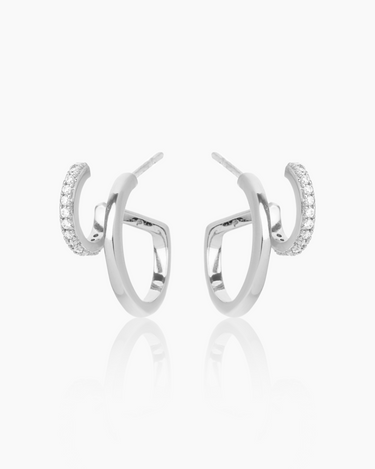 The Clarissa Silver Hoops create a dazzling double-hoop illusion from a single piercing. They feature a smooth, polished main hoop intertwined with a smaller inner hoop, beautifully paved with shimmering cubic zirconia stones. This unique, layered design offers high-impact sparkle and dimension without the need for multiple piercings.